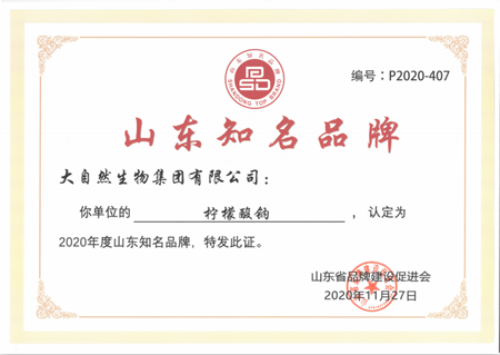 近日,大自然生物集團有限公司收到由山東省品牌建設促進會頒發的榮譽證書,公司的檸檬酸鈉產品榮獲“山東知名品牌”稱號。