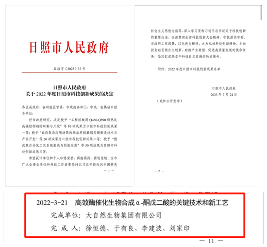 近日,日照市人民政府公布2022年度日照市科技創新成果名單,大自然生物集團有限公司研發的“高效酶催化生物合成α-酮戊二酸的關鍵技術和新工藝” 榮獲2022年度日照市科技創新成果三等獎。